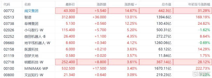 港股閱文集團升超14%,智譜升超13%,阜博集團升超12%,小馬智行升超5%,MINIMAX-WP升超3%。