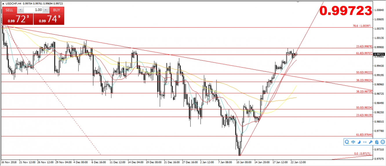 昨天晚间美瑞走势整体偏向震荡。今天的关注焦点不多,主要关注的是晚间的美国政府关门的进一步新闻,有机会影响美元走势,还需要关注的是达沃斯论坛的相关新闻,关注英国脱欧的进一步新闻,有机会影响美元瑞朗走势。其他数据方面今天较为平淡,还是需要留意的是市场情绪以及突发事件。从技术走势上来看,美瑞上方阻力在0.998附近位置,下方支撑在0.996附近位置,下方进一步支撑在0.994-0.993附近位置,进一步支撑在0.992-0.990附近位置,上方进一步阻力在1.000-1.003附近位置,走势偏向震荡