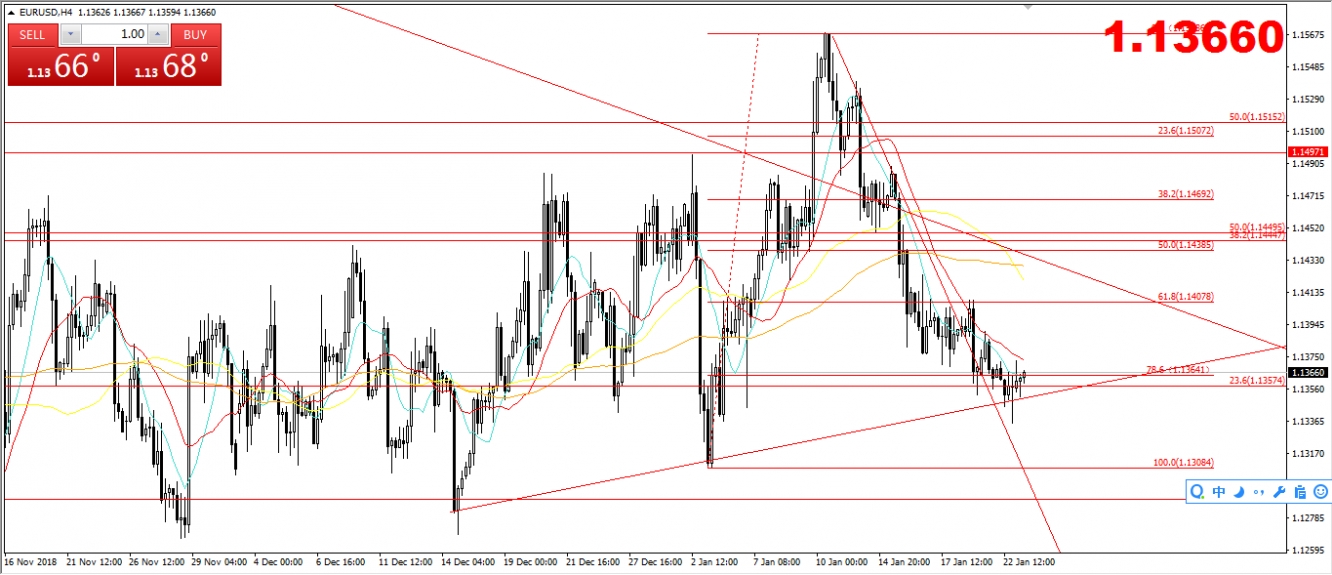 昨天晚间欧美走势波动不强,但是有站稳下方1.135附近支撑的迹象。今天的关注焦点较少,需要关注的是晚间的美国政府关门的进一步新闻,有机会影响美元走势,还需要关注的是达沃斯论坛的相关新闻,关注英国脱欧的进一步新闻,有机会影响美元欧元走势。其他数据方面今天较为平淡,还是需要留意的是市场情绪以及突发事件。从技术走势上来看,欧美下方支撑在1.135附近位置,进一步支撑在1.133-1.130附近位置,上方阻力在1.137-1.139附近位置,进一步阻力在1.40-1.141附近位置,上方进一步关键阻力在1.142-1.143附近位置,有机会出现站稳震荡的走势